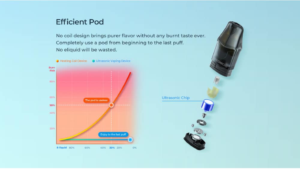 These Chic Replacement Pods do not use coils, instead they utilise Ultrasonic Vaping Technology that changes e-liquid into vapour by using ultra-high frequency vibrations (up to 3 million times per second), there will also never be any burning flavour through this method.